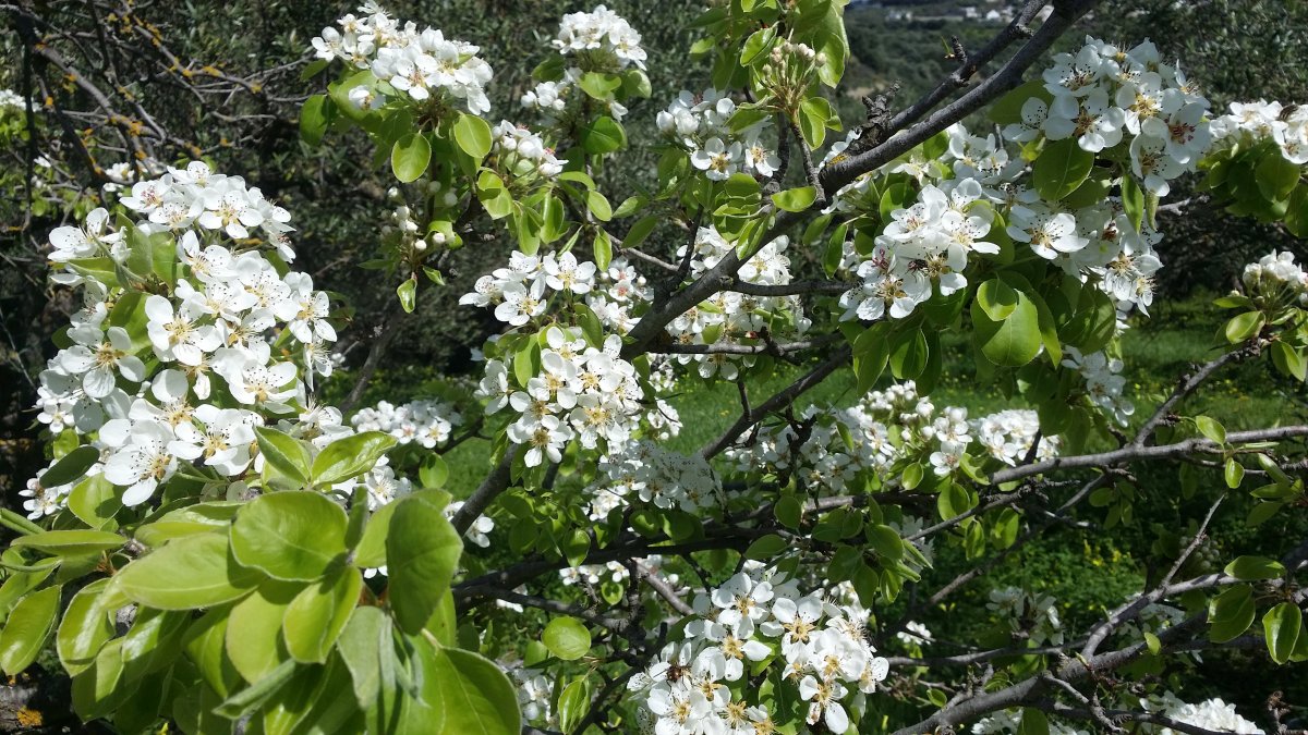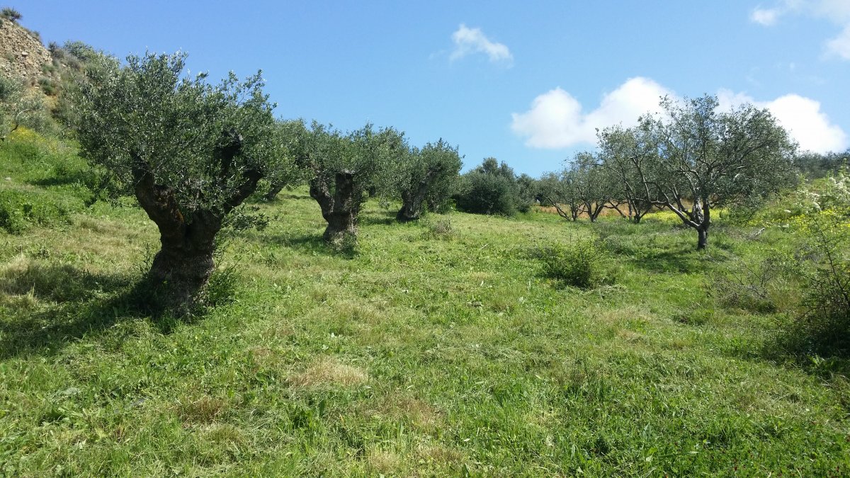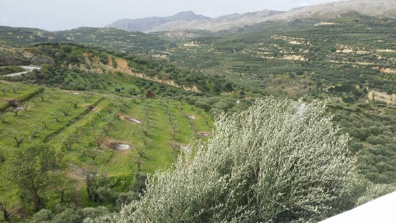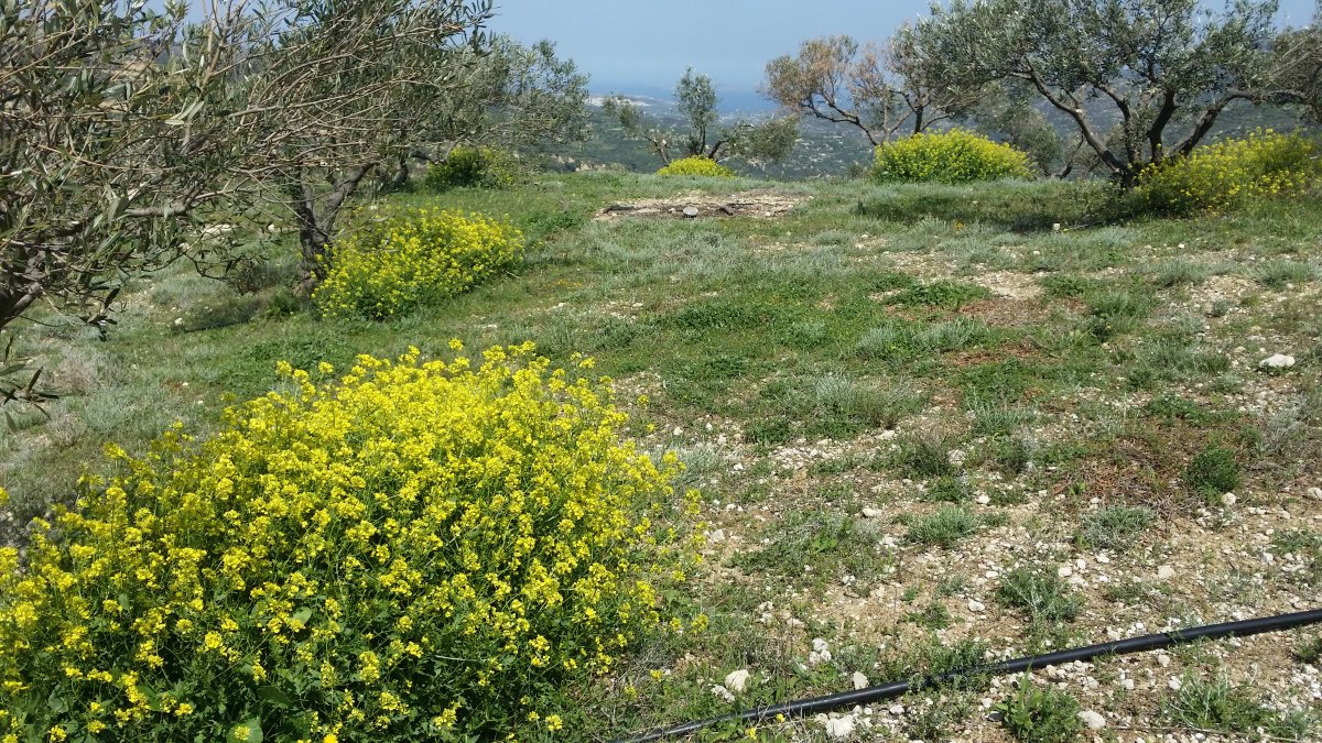 Le temps est épouvantable aujourd'hui. Pluie, orage, vent. C'est la première fois depuis mon retour il y a 15 jours, qu'il n'y a pas quelques heures de soleil dans la journée. Mais disons que ce sera une parenthèse dans ce printemps qui s'installe de plus en plus solidement chaque jour. Les amandiers sont en fleur, orangers et citronniers en font autant, ainsi que d'autres que je ne sais nommer dont celui que je mets en photo (pommier ?) en espérant que quelqu'un me donnera la réponse. Nous marchons beaucoup et j'ai l'impression de me promener dans un gigantesque jardin. Régulièrement des effluves d'origan chauffé par le soleil, sont portés par le vent et j'aime particulièrement cette odeur, comme d'ailleurs j'adore le goût de cette plante. Je joins la photo d'une oliveraie où cohabitent jeunes et vieux oliviers. Les vieux sont étonnamment taillés pour avoir de gros troncs et petites ramures. Autre photo : le colza sauvage qui lui aussi sent merveilleusement bon. Ceux de cette photo sont systématiquement disposés au pied des oliviers qu'on voit au sommet d'une colline en plein vent. La régularité fait penser qu'ils sont plantés. Le lieu est celui d'un ancien site minoen dont il ne reste rien mais qui est situé en haut d'une colline circulaire au milieu d'une vallée. Très belle vue à 360°. Et de  là, on peut apercevoir sur une autre colline de nombreux cyprès, peu fréquents ici, concurrençant les oliviers, ce qui lui donne un petit air toscan.