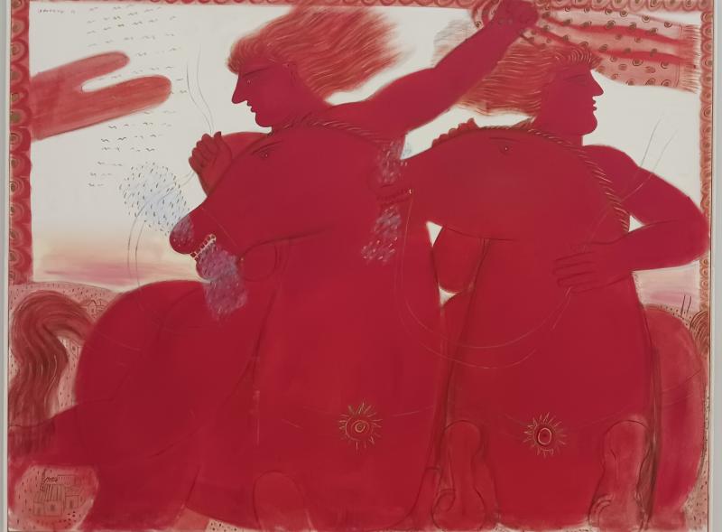 En photo de titre, un tableau d'Alekos Fassianos, peintre grec contemporain, exposé à la Galerie nationale. Nous avions vu une expo à Paris. Son style est très reconnaissable. Toujours des personnages massifs, généralement des hommes nus, rarement des femmes. Souvent des chevaux. Toujours des couleurs vives, ici le rouge, souvent le bleu. Une peinture nourrie de mythologie grecque.