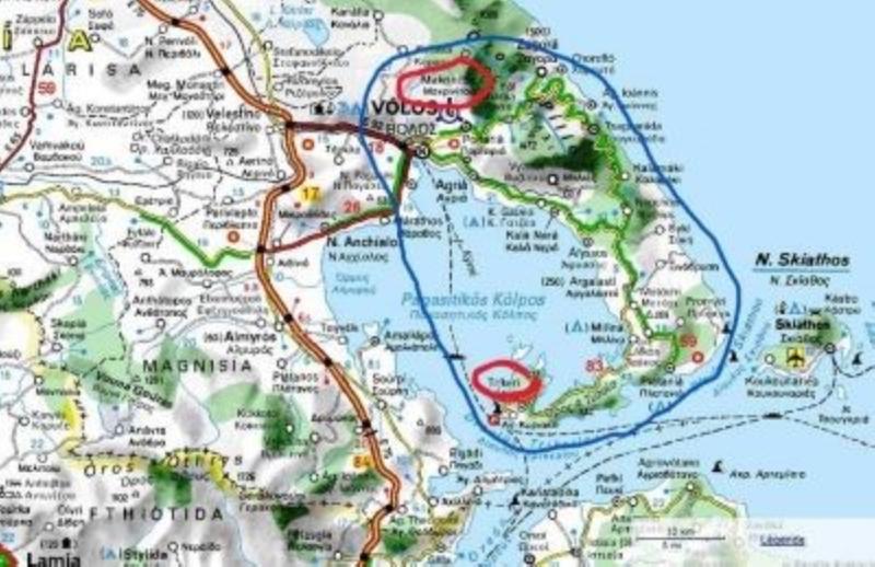 Au sud, la péninsule du Pélion ferme presque complètement le golf de Volos (son vrai nom est golf Pagasétique). Elle est alors assez près de l'île d'Eubée (en arrière plan de la photo) à laquelle elle n'est malheureusement pas reliée par ferry ou bac hors saison touristique (ce qui nous a contraint à faire le tour par la route). Là, un village de pêcheurs tranche complètement sur les autres villages de la péninsule, Trikeri, est perché sur une  hauteur et le port se situe en contrebas. Ici pas de pierres de taille ni de lauzes. Du blanc et du bleu, c'est joli comme de nombreux village grecs, mais la vue sur la mer Égée et sur Eubée est exceptionnelle.