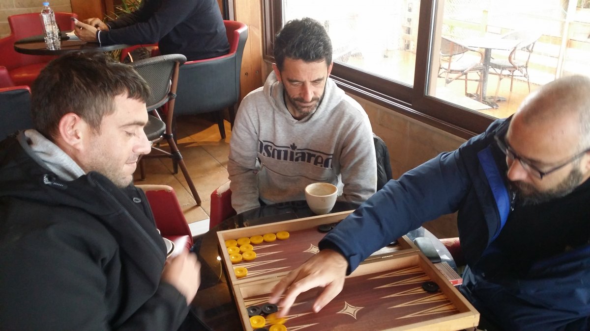 A Elounda, j'ai fait ce midi un repas de panini et d'un verre de délicieux vin blanc dans un petit bar sympa tenu par un jeune Grec qui a vécu un an à Rennes et qui adore Nantes. Des clients jouant au Tavli m'ont autorisé à les prendre en photo. C'est celle que vous voyez aujourd'hui.