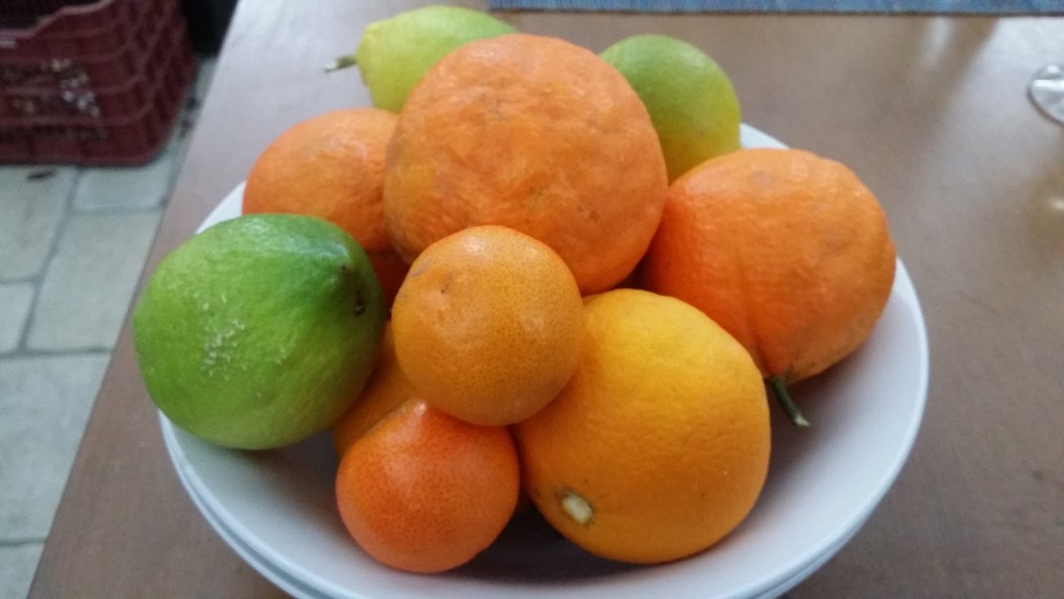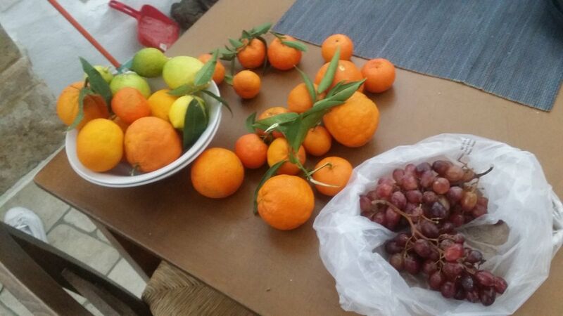 Sur la route j'ai trouvé, en retrait d'un chemin après un virage, des orangers, des citronniers et un clémentinier (ça se dit ?). Pas de clôture. J'ai fait provision d'agrumes et notamment de ces petites clémentines absolument délicieuses et sans pépins. C'est assez génial de pouvoir se servir.