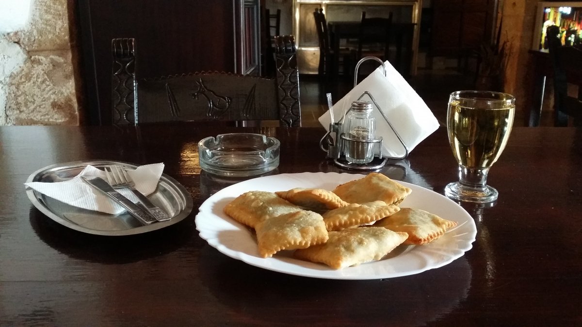 En revenant, petite visite à la plantation de bananiers (cf. photo) puis dégustation de vin blanc bio au monastère de Toplou. Et des petites pitas aux épinards (cf. photo) pour déjeuner. J'ai appris à les faire, soit uniquement aux épinards (spanakopita) soit épinards et fromage (spankotyropita), avec une pâte à l’huile d'olive que j'ai improvisée et c'est délicieux. Le lieu de dégustation est une maison de pierre très typique et arrangée avec goût et soin (je n'ai pas pu réorganiser les photos sans tout recommencer : la 4 et la 8 vont ensemble).