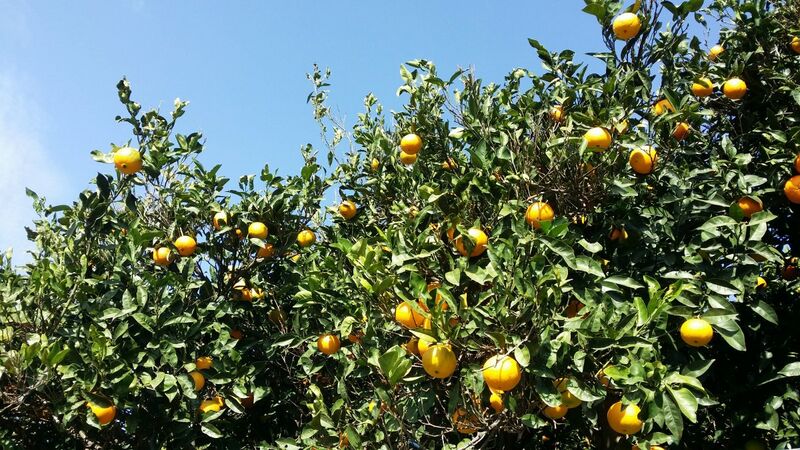 En photo, un oranger, arbre qui m’émerveille. Je crois que c'est lié à l'enfance. Je n'imaginais pas qu'il existait des arbres à oranges, n'en ayant jamais vu. Idem pour les citronniers : c'est magnifique. Quelques oranges dépassant de la clôture, j'ai commis un larcin en en cueillant une pour la manger. Délicieuse.