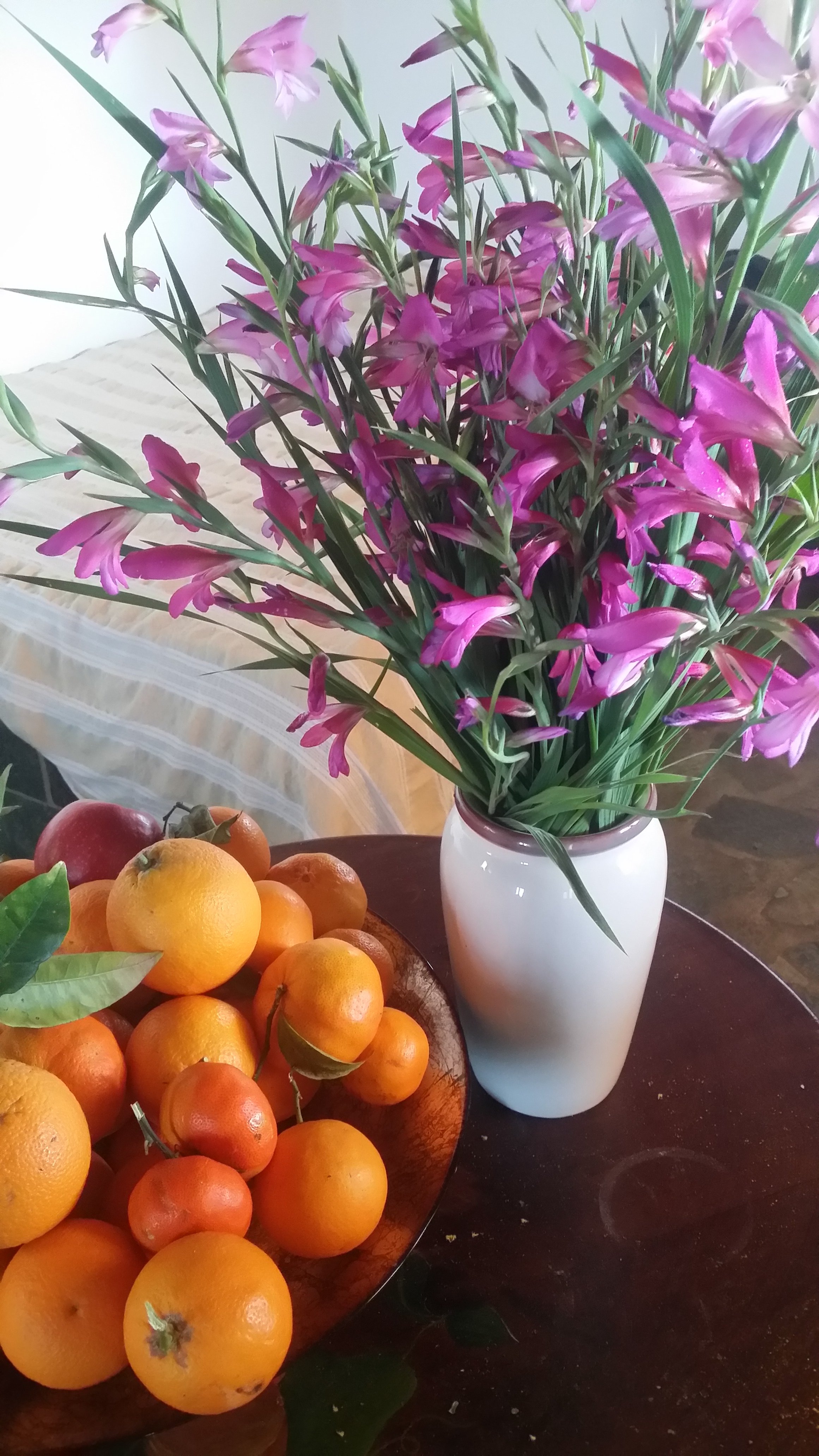 Parmi les photos, on peut voir ces merveilleux "glaïeuls sauvages" très présents en ce moment ; les fleurs d'orangers dont l'odeur ressemble à celle du jasmin. J'ai beaucoup aimé l'araignée fort petite et fort jolie (il faut grossir la photo), et surtout le papillon sur une fleur d'oranger. Un peu inquiétante une plante qui ressemble à une carnivore, vue en un exemplaire unique au pied d'un cep de vigne.