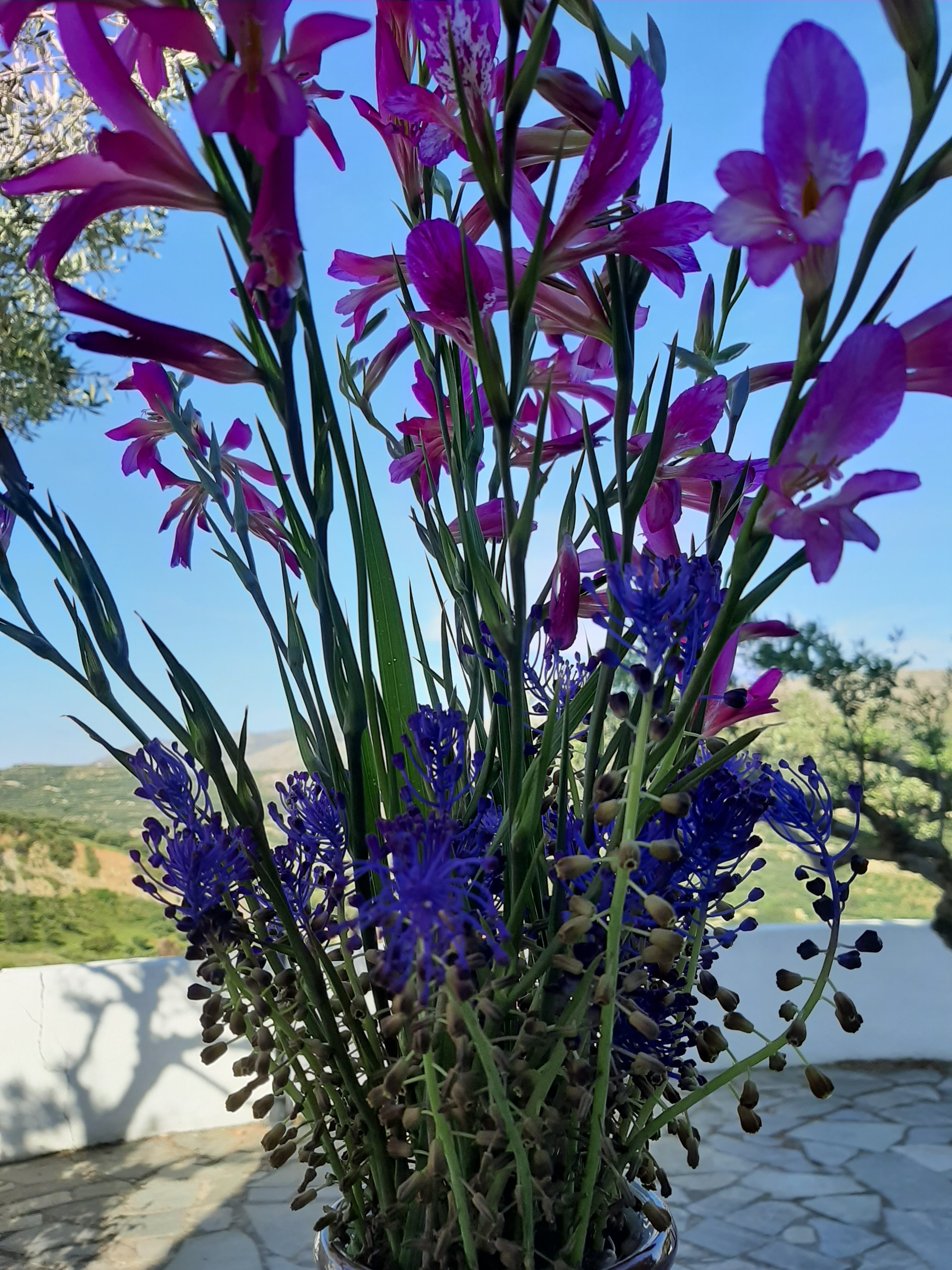En photo, faute de muguet, un bouquet de "glaïeuls d'Italie" qui foisonnent actuellement partout et de "muscaris à toupet" dont le bulbe ici se mange, paraît-il, en hors-d’œuvre et en accompagnement des viandes.