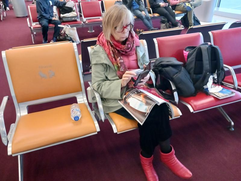 Monique s'entraîne sur son blog que lui a réalisé Fabrice. Ça passe vite parce que l'embarquement se fait tôt car c'est un gros porteur, Boeing 777 et qu'on est plus de 300 personnes dans l'avion . Ca prend environ trois quart d'heure ensuite nous aurons 13h30 à passer dans les airs. Vers 11h on nous sert à déjeuner. Il est 11h pour nous, 19h pour le Japon et quand on arrivera il sera 6h le 4 novembre à Tokyo. Le repas est précédé d'une coupe de champagne. Merci, merci Air France. C'est classe et agréable. Ensuite pour un repas dans les airs c'est vraiment bon et ça change des lowcost où l'on paye la moindre consommation. Ensuite pas mal de temps à occuper. Peu de sommeil car mon horloge biologique enregistre qu'on est en pleine journée. Je regarde un premier film "l'As des As" avec Belmondo pas vraiment récent mais plutôt sympa. Un film de Gérard Oury avec des gags un peu classiques qui me font éclater de rire. Il faut que je sois moins bruyant mais cest irrépressible. Ensuite tentative de sieste avec du lexomil. Jai vaguement dormi pendant une heure. Monique réussit à dormir. Puis un deuxième film "le mystère Henri Pick avec l'ineffable Luchini. Assez bonne satire du monde de l'édition littéraire. Je passe un bon moment. Monique regarde "Frères". Je comptabilise 6h déjà passées sur les 13h30 de vol. Je lis un livre "Ni d'Eve ni d'Adam d'Amélie Nothomb", son deuxième roman Japonais. François nous l'a envoyé avant notre départ. Super sympa de sa part. C'est un cadeau de circonstance. C'est drôle, un peu superficiel, en fait c'est plus un roman de journaliste que de romancier c'est très factuel et assez didactique en tout cas agréable à lire, évidemment avec le style pince-sans-rire d'Amélie Nothomb. Je tente une nouvelle somnolence. Rien. Nouveau film "Frères" que Monique m'a conseillé. J'apprécie cette histoire de deux enfants de la guerre, abandonnés, livrés à eux-mêmes pendant 7 ans dans des forêts C'est d'après une histoire véridique. On les rencontre ensuite adultes et leur enfance forestière nous apparaît par de longs flashback explicatifs de leur devenir. Il paraît qu'il y aurait eu plus de 300.000 enfant ainsi perdus pendant la guerre. C'est un beau film sur une amitié profonde, liée dans l'enfance, de deux hommes devenus inséparables. Je somnole de nouveau difficilement. Puis je regarde un 4e film "Bernadette" Inspiré de la vie de Bernadette Chirac et d'intérêt moyen. Enfin à 4h Tokyoïte arrive le petit-déjeuner. Très correct. Vers 5h le jour se lève à 11.000 mètres d'altitude et on assiste à une belle aurore. Ver 5h30 on découvre le mont Fuji qui dépasse d'une couche de nuages. Il fait presque 4000 mètres de haut. Et puis enfin, peu après 6h on atterrit. Très bel atterrissage en douceur de ce géant aérien. Ensuite il y a une longue queue pour passer au contrôle douanier. On prend nos empreintes digitales numérisées des photos, puis vérification des passeports.