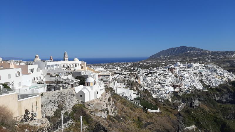 Quand on parle de Santorin, on désigne l'île principale, grosso-modo orientée nord /sud où se trouvent plusieurs villages dont les plus touristiques, Oia (prononciation : Ia) et Fira qui sont magnifiques. Quand on voit l'île de loin, c'est spectaculaire. Les villages blancs accrochés en haut des falaises de plus de 300 mètres couronnent les roches volcaniques empilées en strates. On croit d'abord voir de la neige en haut de montagnes abruptes puis, en s'approchant on découvre les strates volcaniques de couleurs qui vont du noir au rouge foncé et au blanc et évoquent un gâteau géant fait de couches et surmonté de crème.