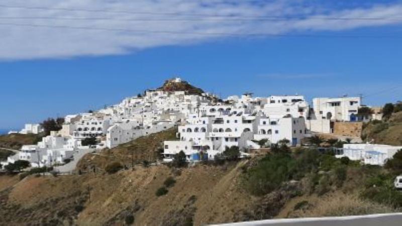 C'est une île peu fréquentée parce qu'elle ne présente aucune des caractéristiques qui intéressent le tourisme : rien de tapageur, pas de sites facilement accessibles, peu desservie par les ferries. Une île très sauvage et "authentique" qui n'intéresse que les férus de randonnée, grecs ou étrangers. Il n'y a pas vraiment d'hôtels mais de rares résidences de vacances. On trouve aussi des locations chez l'habitant, comme ce fut le cas pour nous : chambre avec coin cuisine et petite salle d’eau/toilettes.
