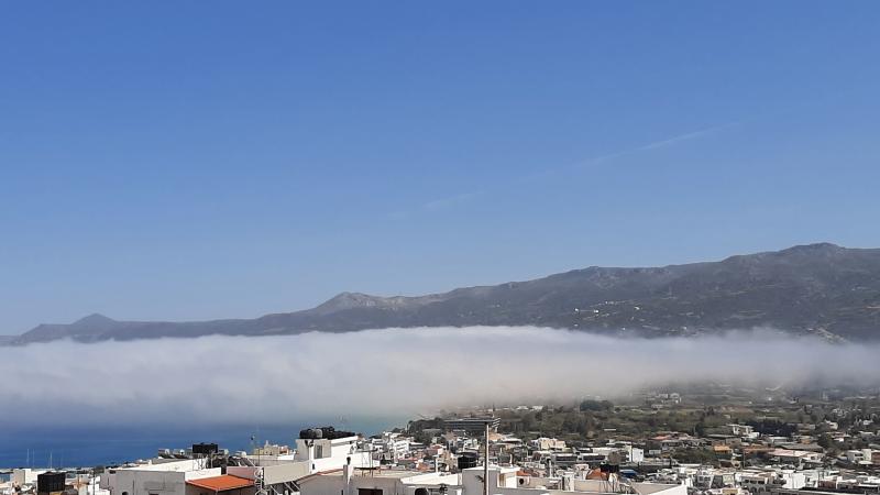 Pour le deuxième jour un phénomène de différence de températures dans l'air et sur l'eau (photo de titre) évoquant plutôt une vallée de montagne que la mer se produit : une assez épaisse couche nuageuse au ras de la mer dans la baie de Sitia par dessus laquelle on voit la montagne en face de chez nous. Nous n'avions jusqu'à présent jamais vu ce phénomène mais peut-être parce que cette année nous sommes arrivés beaucoup plus tôt que les deux années précédentes.