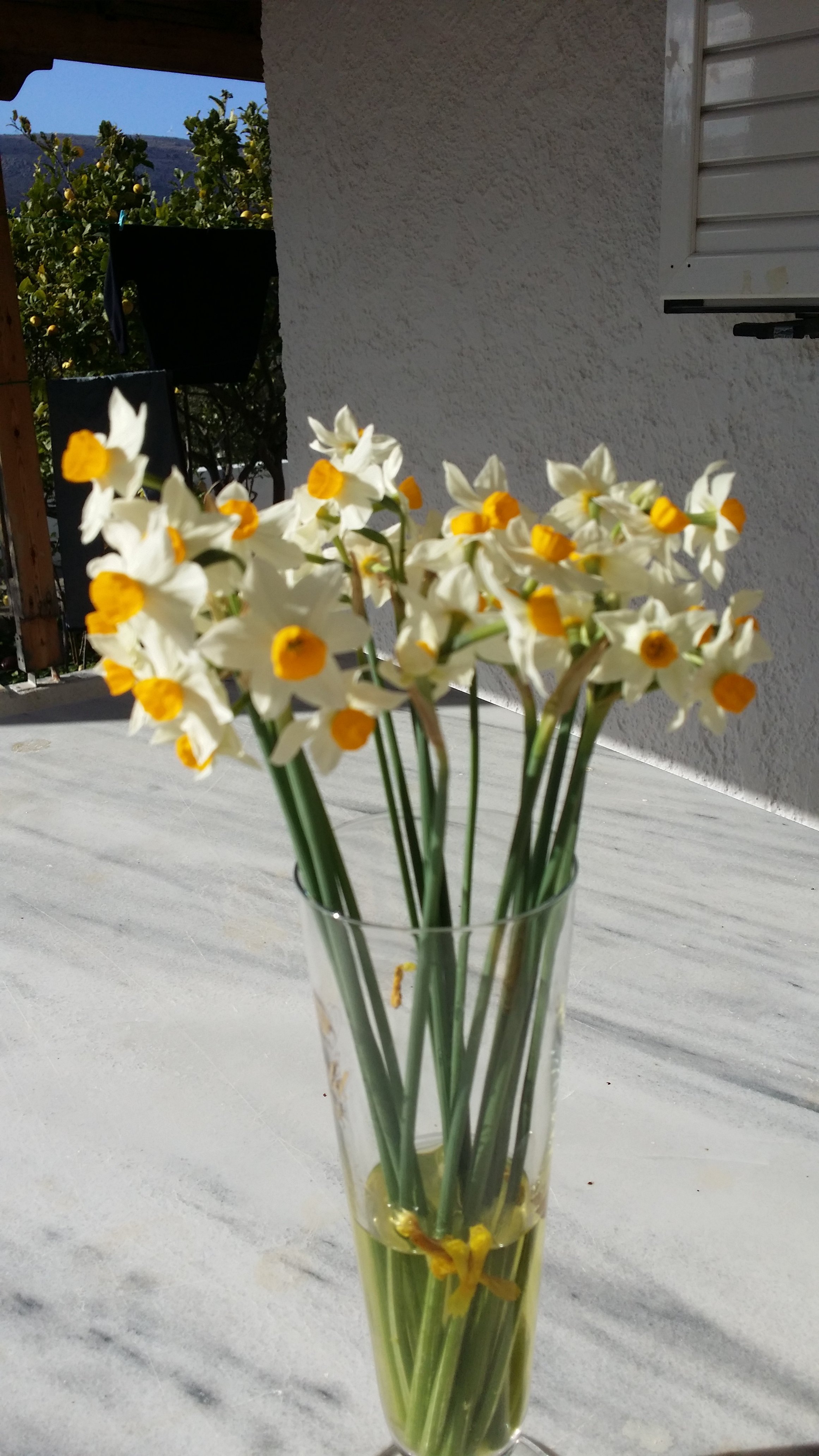 Des jolies fleurs ornent les oliveraies, c'est magnifique. Hier j'ai posté ces jolies petites fleurs violettes qui sont sans doute des anémones sauvages. Les jaunes (cf. vidéo) je ne sais pas ce que c'est mais c'est dans leur feuillage qu'adore se rouler Brida (je ne résiste pas à poster une nouvelle vidéo comme je l'avais fait l'année dernière). Cette chienne est délicieuse, elle vient me voir dans ma nouvelle maison. Hier matin elle m'attendait dans mon jardin quand je me suis réveillé. Elle adore se promener. Et évidemment comme on est au pays des plus grands philosophes de tous les temps, nous échangeons des dialogues très philosophiques quand nous marchons... les autres fleurs sont comme de petites narcisses, elles sont délicates et d'un parfum délicieux. Je n'en ai trouvé qu’en un endroit près d'un ruisseau.