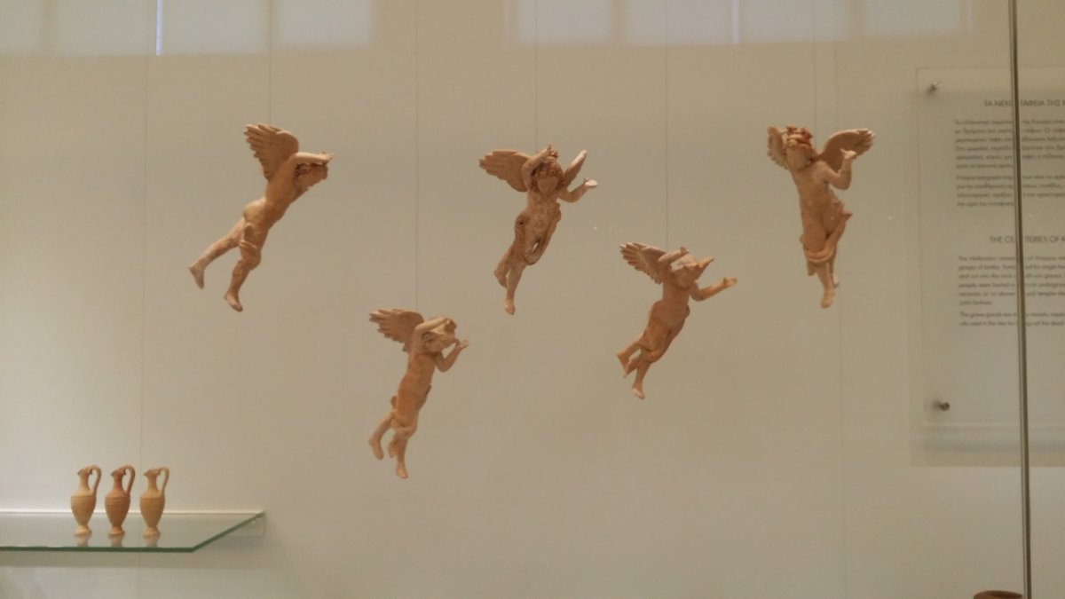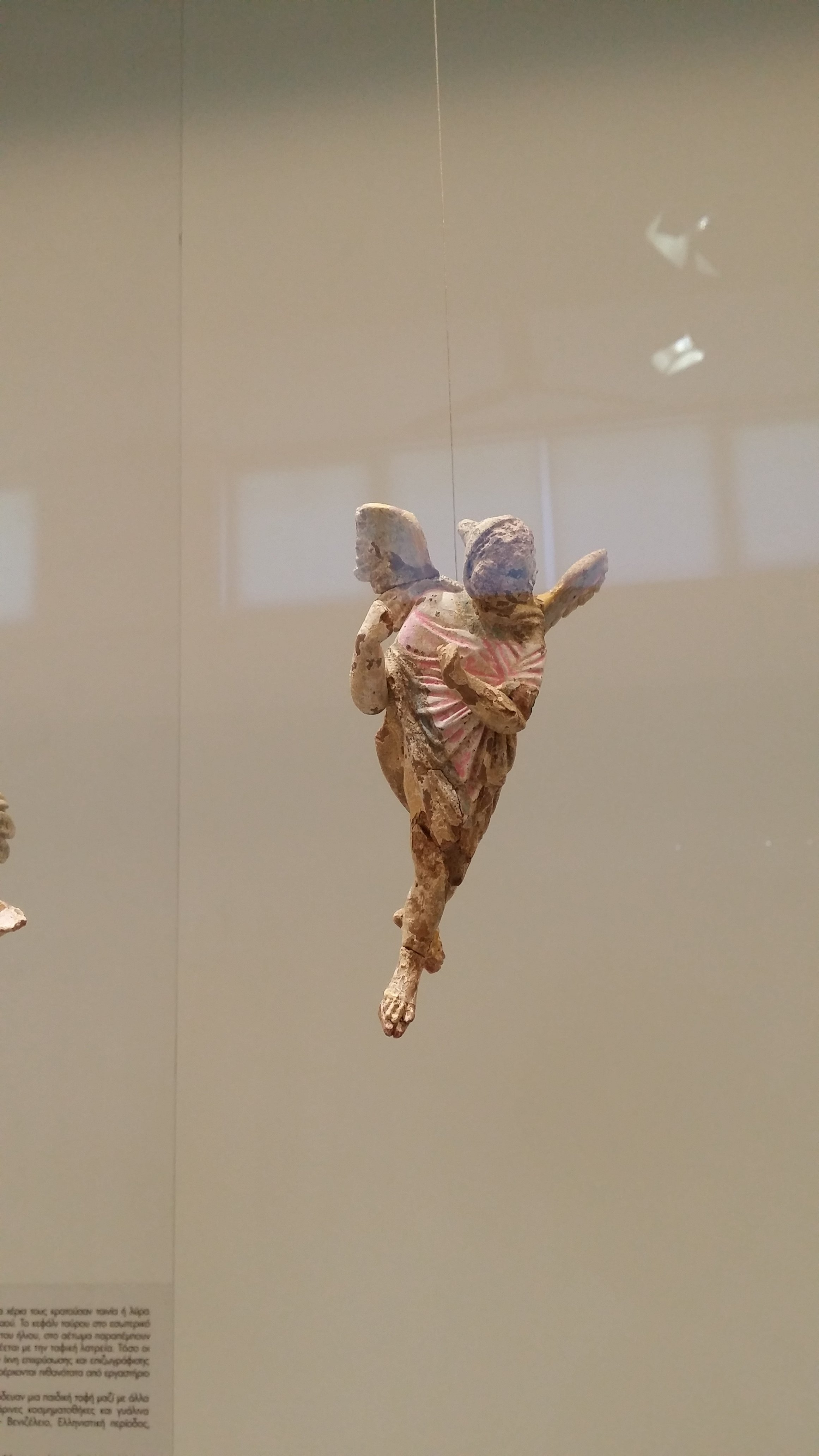 Avec Martine, avant son avion, j'ai revu le musée d'Heraklion. Une merveille. Il est beau par sa richesse, beau par son aménagement et sa facilité de circulation interne. J'ai téléchargé des photos de petites figures qui ressemblent à des anges. Ce sont des Éros et une Aphrodite, des maquettes miniatures avant sculpture sur un fronton de temple crétois à la période romaine, 150 ans avant JC. C'est doublement intéressant pour la réflexion : la mise en scène des musées (ici l'impression de personnages volants) donne une dimension imaginaire aux objets et nous montre que nous ne pouvons pas  voir les choses comme elles étaient. Mais en même temps elles nous appellent à y réfléchir. On est tellement habitué à voir des pierres nues, qu'on en oublie par exemple qu'elles étaient peintes (comme dans les église romanes) et, quand on voit la photo de la tenture devant le temple d'Agrigente (Sicile) empruntée à Wikipédia, qui nous en donne une idée, force est de se demander si les ruines ne sont pas plus belles. Les figurines qu'on voit ici, elles aussi étaient peintes : on voit encore un peu de peinture sur l'Aphrodite ailée. Mais a-t-on vraiment envie de les voir ainsi ?