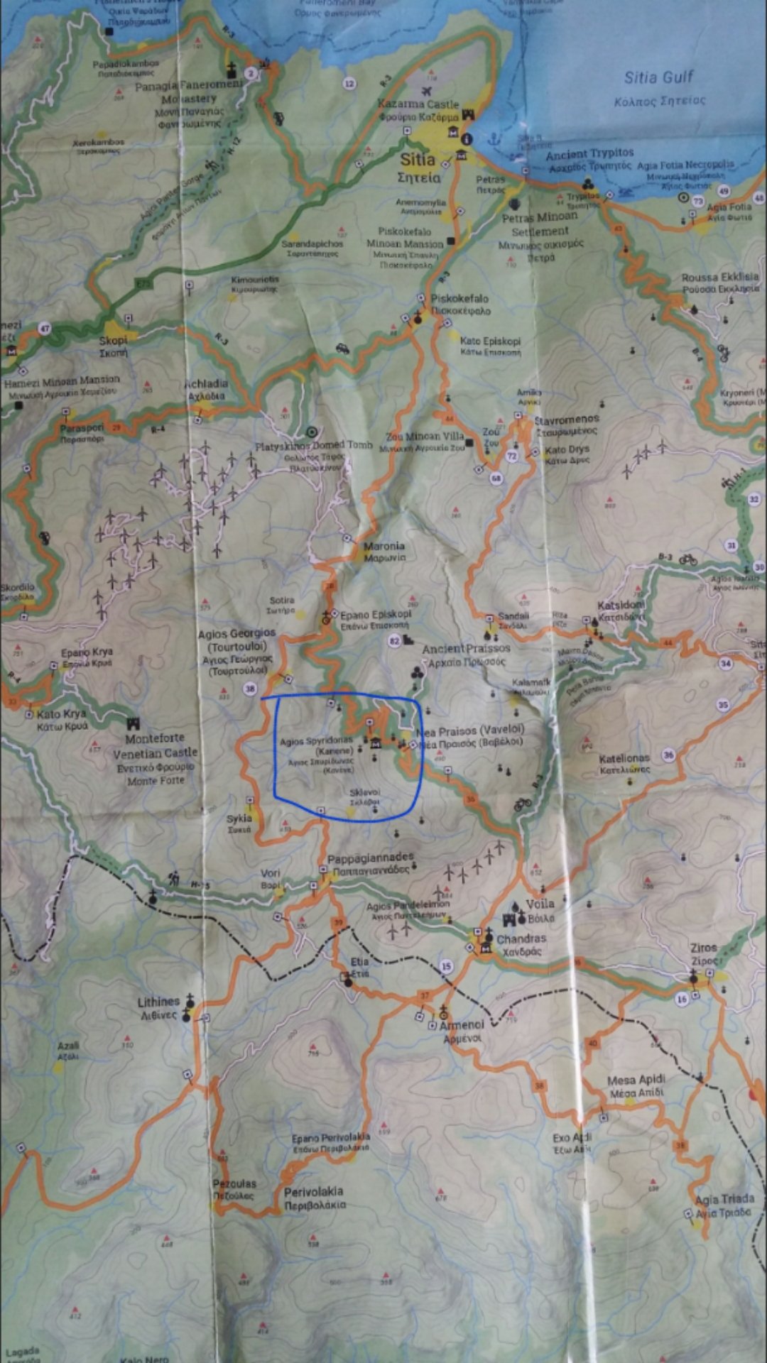 Au Nord est de Sitia, est un ancien monastère, celui de Toplou qui est aujourd'hui un centre culturel et un lieu de production d'une délicieuse huile d'olive  (to eleolado) et de vin (très réputé). Le monastère est situé en hauteur près d'une gorge parcourue par un sentier de randonnée en boucle jusqu'à la mer et retour. Temps indiqué par le guide géopark : 1h30.