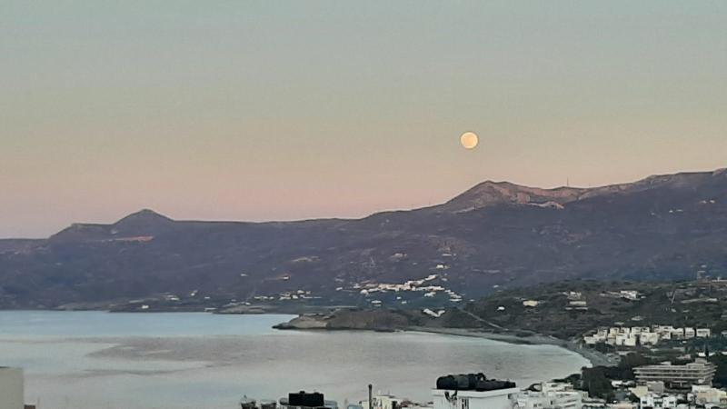 Notre appartement est situé tout en haut de la ville sur la colline. La photo principale est une vue nocturne sur la baie de Sitia depuis notre terrasse. C'est une grande terrasse qui donne à l'est. Le matin nous avons beaucoup de soleil de face dès 6h puis vers 7h nous nous protégeons avec le store quand il est déjà assez haut et aveuglant. Il fait très beau et très chaud. Au début nous avons eu des vents d'est qui nous apportaient du beau temps mais un peu frais malgré le soleil ; et d'ouest, peu agréables, porteurs de nuages. Depuis deux jours, le vent du nord semble s'installer, je pense que c'est le fameux "meltem" de la mer Égée qui souffle tout l'été et rend la chaleur plus supportable mais qui peut aussi générer du bon frais voire des tempêtes sur les Cyclades en plein été. Ici c'est beaucoup plus modéré, nous sommes très au sud de la mer Égée.